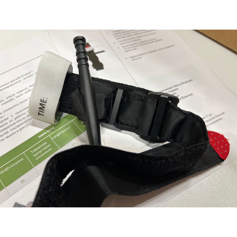 - Липучка-velcro расположена по всей длине ремня, что позволяет использовать жгут на конечностях поверх зимней одежды, обеспечивая надежное крепление и фиксацию.