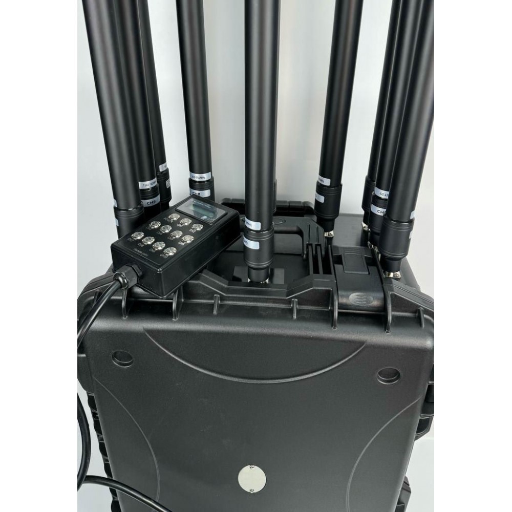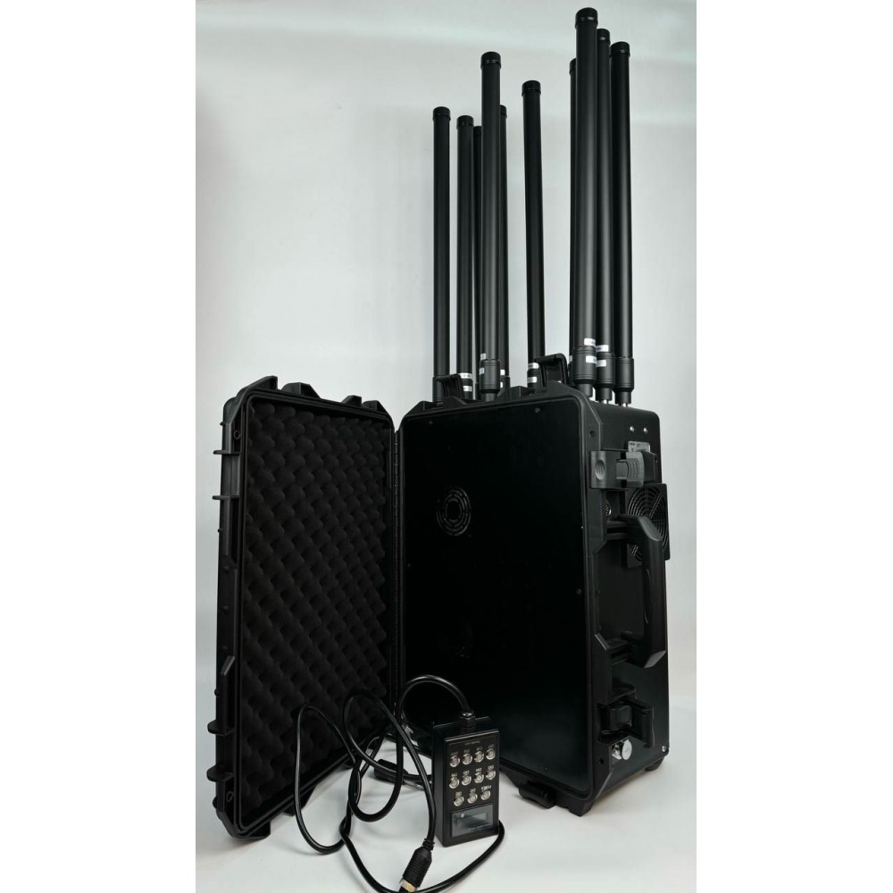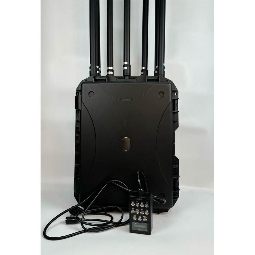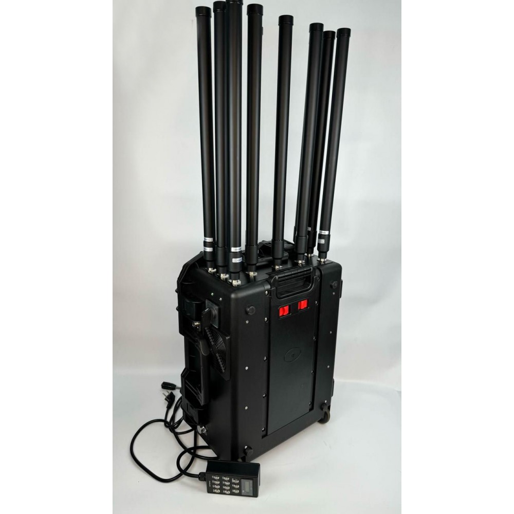 Данный подавитель блокирует сигналы на 10 каналах. Встроенная аккумуляторная батарея емкостью 30,000 мАч позволяет использовать устройство вдали от стационарных источников питания, на открытых пространствах. Мощность 500 Вт и всенаправленные антенны обеспечивают дальность подавления в диапазоне от 500 до 1500 метров.